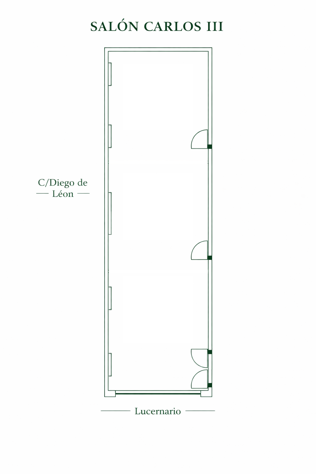 El Salón Carlos III es un espacio privado, elegante y lleno de luz natural, situado en la primera planta del hotel. Conserva las molduras originales del edificio y un impresionante lucernario francés del siglo XIX que aporta una iluminación cálida y sofisticada durante todo el día, creando un entorno ideal tanto para reuniones corporativas como para eventos sociales. Cuenta con una zona de bienvenida con sofás, ideal para recibir a los asistentes o para momentos de descanso durante el evento.